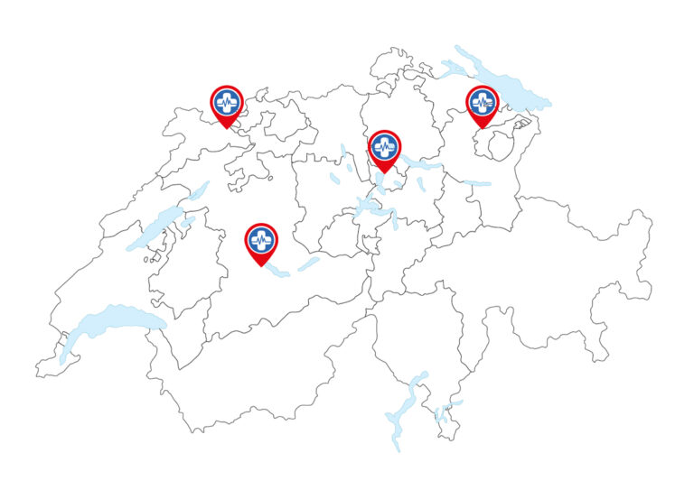 Unsere Mini Therapie Zentren befinden sich in vier verschiedenen Regionen der Schweiz, um eine möglichst einfache Erreichbarkeit für unsere Patienten zu gewährleisten. In unseren modern ausgestatteten Einrichtungen schaffen wir eine angenehme und unterstützende Umgebung, in der unsere Patienten sich wohl und gut aufgehoben fühlen können.